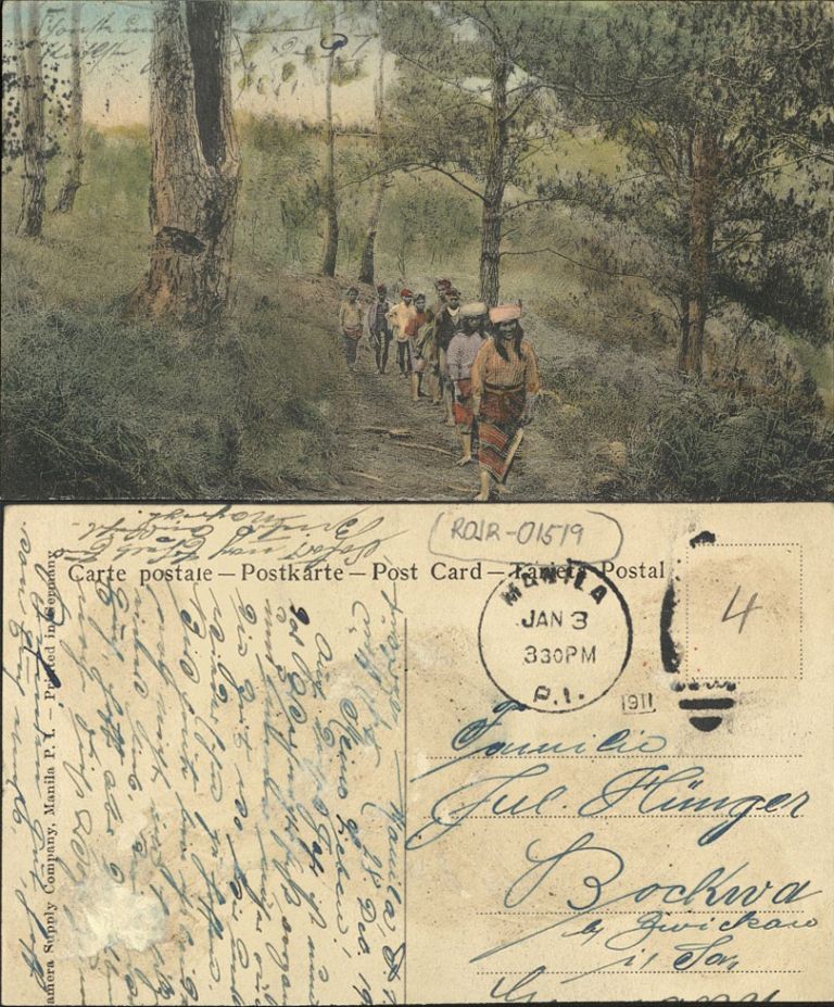 Subject: Group of eight indigenous Filipino men and women (Igorot?) walk on trail through pine trees.