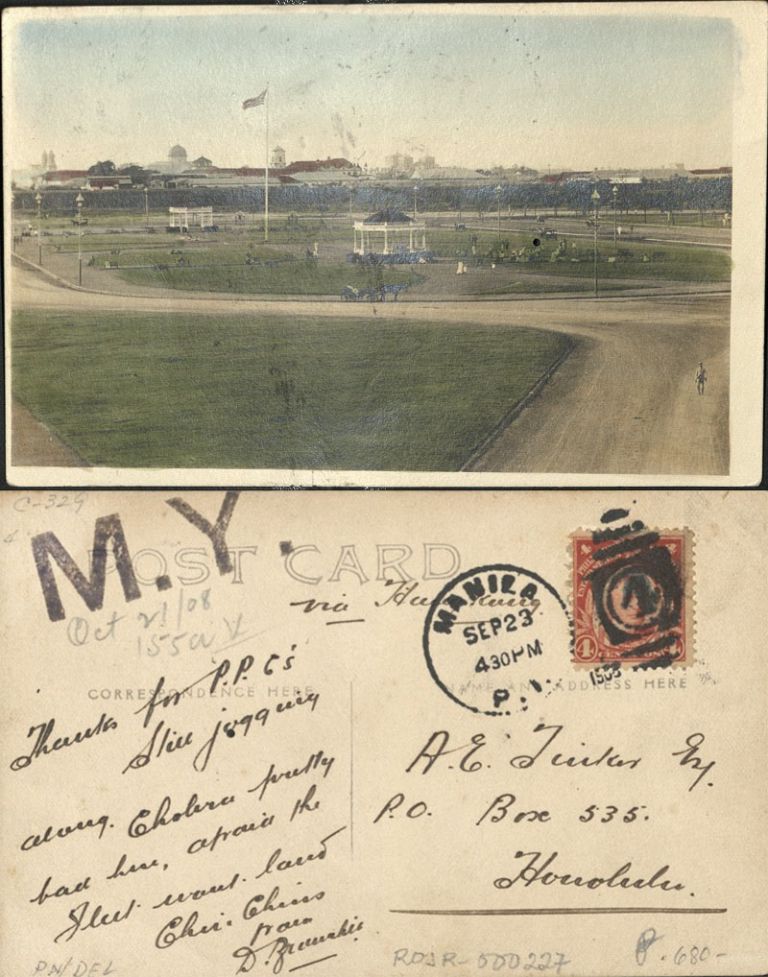 Subject: Luneta Park with gazebo, flagpole, people and a calesa; Intramuros in distance.