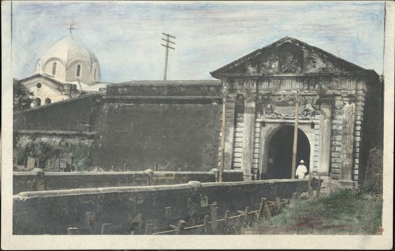 Subject: Bridge and Parian gate to Intramuros, Manila; church dome visible over wall.