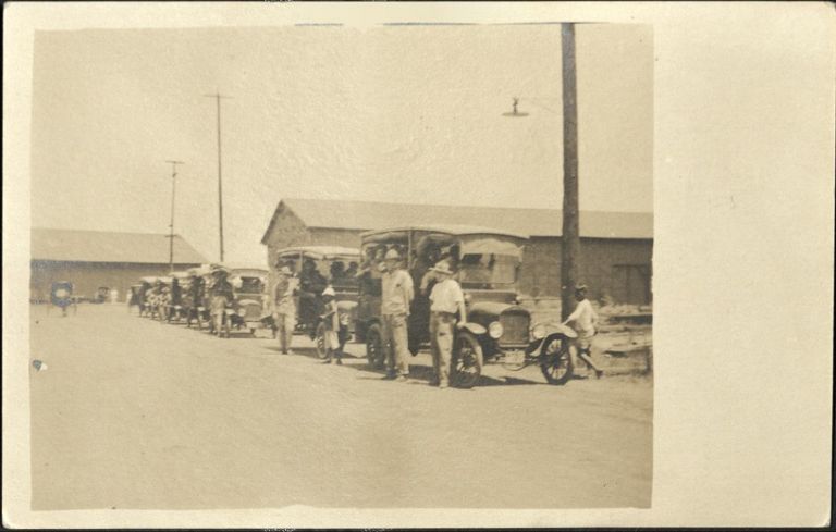 Subject: Line of 1920s era trucks loaded with people, Americans (soldiers?) standing by trucks.