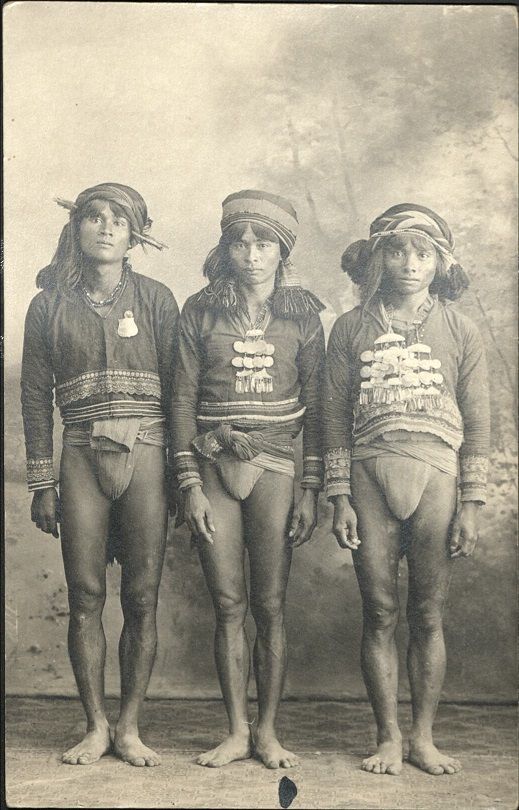 Subject: Three young indigenous men in native dress �loincloths, embroidered tunics, capiz-shell necklaces, and headdresses � pose before a painted wall.