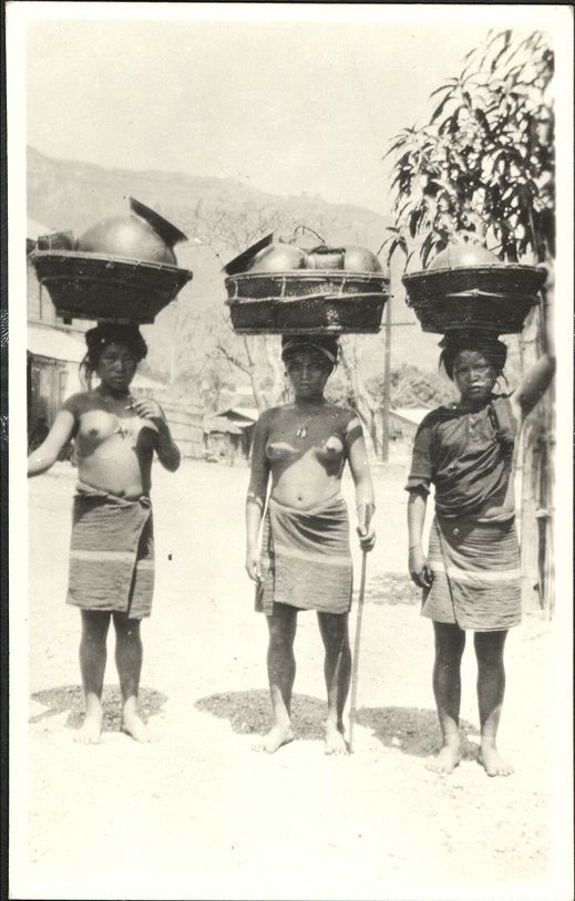 Subject: Three indigenous women carry head baskets filled with pottery jugs in mountainous territory.