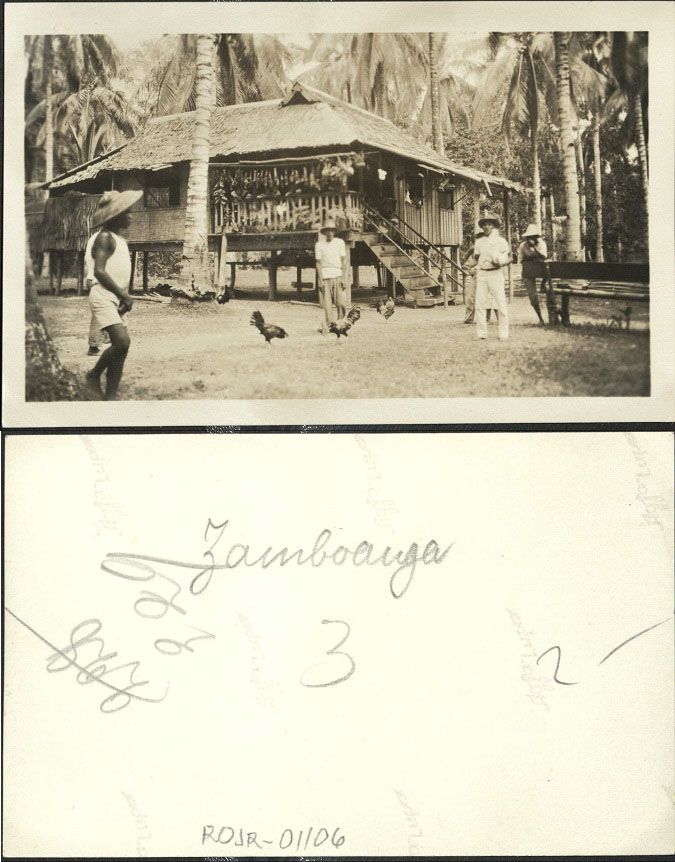 Subject: Several people and roosters outside elevated house or building amid palm trees in Zamboanga.