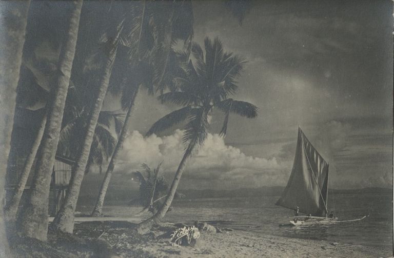 Subject: Darkened beach scene in Zamboanga or Jolo with boat tied to coconut tree, nipa hut on left.