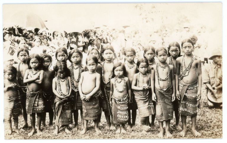 Indigenous Philippine children (possibly Igorot) pose in native dress and beads at a larger gathering or festival.