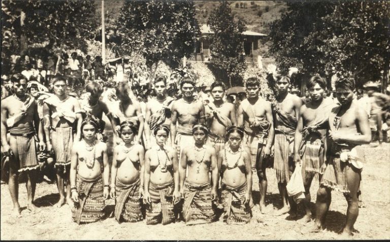 Subject: Indigenous Philippine young men and women (likely Igorot) pose in native dress and beads at a larger gathering or festival; mountain in background.