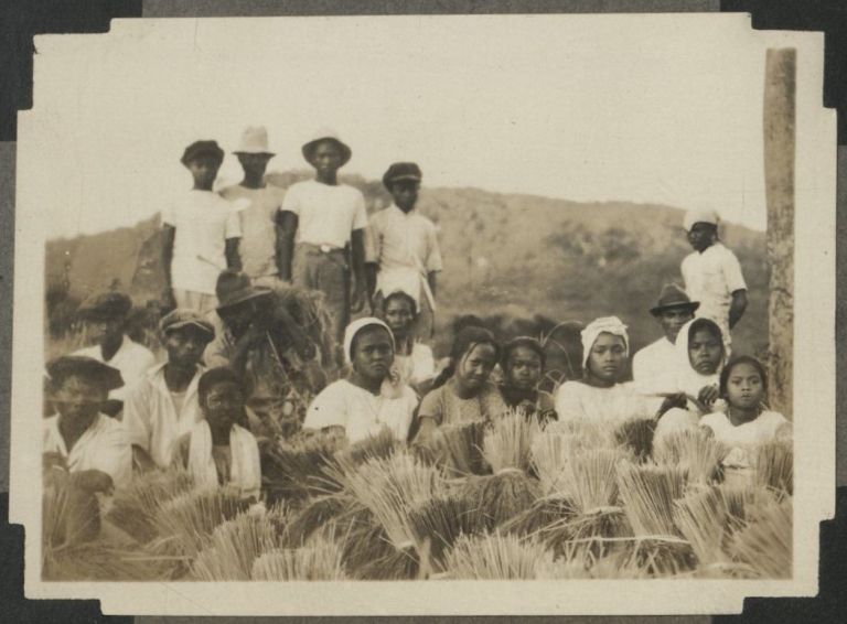 Subject: Igorot men and women, notably wearing western-styled t-shirts and tops, pose for a group photo with stalks of grain. See also OFI-001280, where this group is portrayed at a harvest dance.