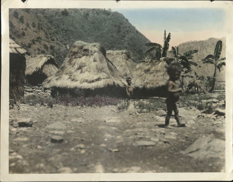 Subject: Young Igorot children in a village at the base of steep mountains. Igorot huts were commonly partially dug into the ground with stone walls and thatched roofs - see ROJR-0015