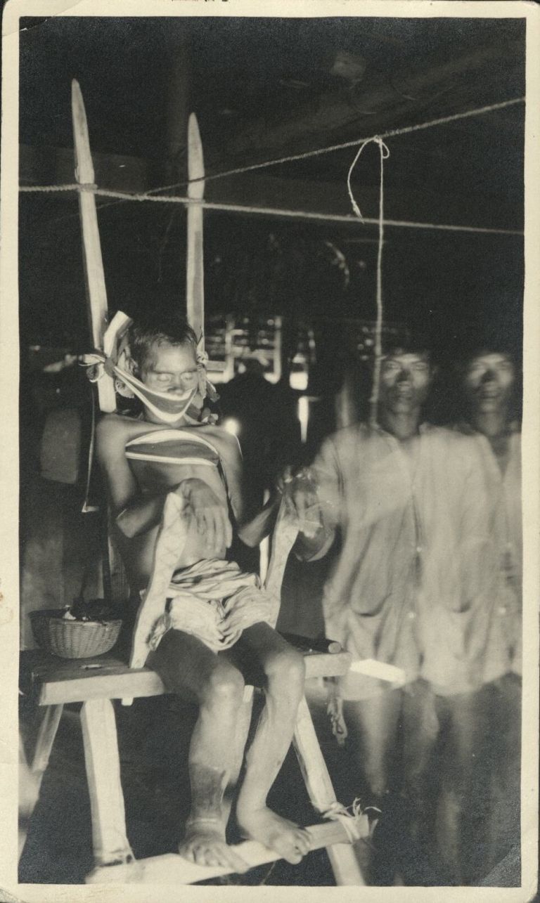 Subject: I suspect the man tied to the chair is dead (the eyes are vacant) and he is being prepared for disposition. Perhaps he is an Ibaloi, and his body is being prepared for mummification by smoke