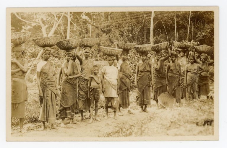 Thirteen woman and a boy, most carrying head baskets, pose along a path. Unclear if this image is from the Philippines.