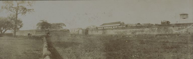 Subject: Intramuros walls and weed-choked moat, with probably the Parian Gate just visible. That would make the structure on left the Revellin de Parian, and this would be a rare view of th