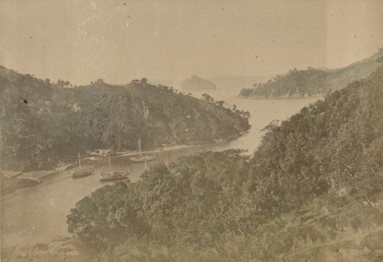 Subject: A common tourist image of Takaboko, Nagasaki, Japan, with boats anchored in a small inlet. U.S. Army transports typically stopped in Yokohama or Nagasaki for ref
