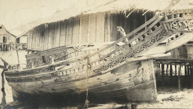 Subject: Elaborately carved wooden boat of the type used by Badjaos [Bajau], beached in Jolo. Bajau are traditionally from the many islands of the Sulu Archipelago, and usually live a seaborne lifesty