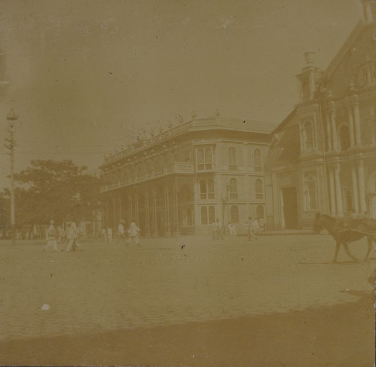 Subject: The La Insular Building was built in 1888 at Plaza Calderon de la Barca and became a notable landmark in Binondo's major plaza, together with the old Hotel de Oriente (not visible,