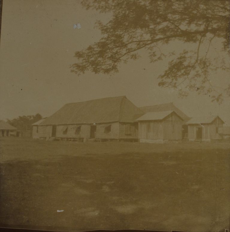 Subject: Sadly uncaptioned image of large nipa structures with smaller wooden out-buildings in a field. They may be military barracks.