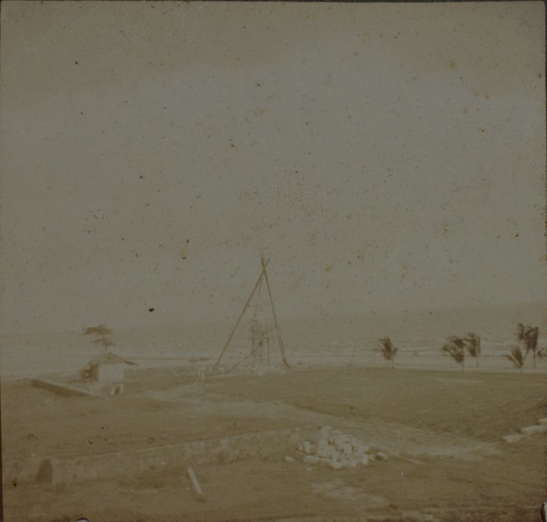 [Untitled - Large tripod structure (scaffolding?) on Philippine shoreline].