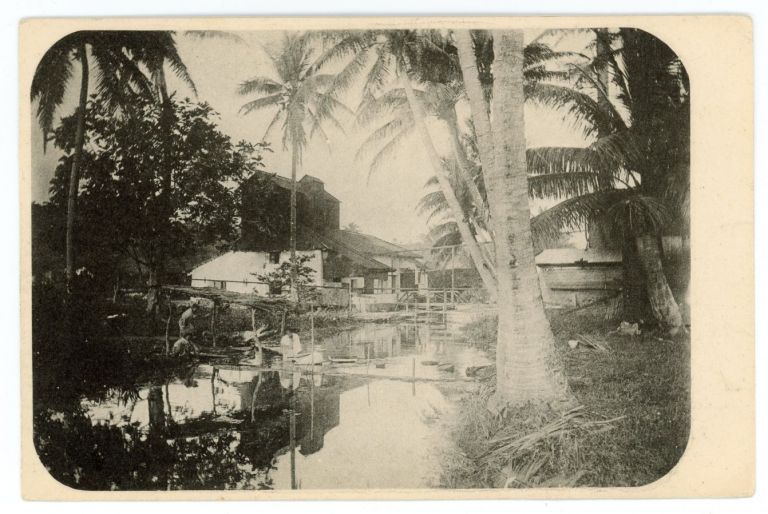 Filipinos washing or doing laundry in a river running next to a tall building - likely a mill, processing plant or factory.