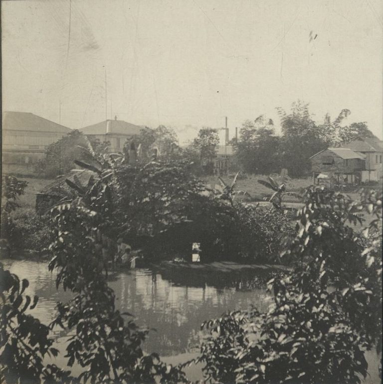 Subject: Filipinos washing clothes in a small river with buildings and factories in the distance. Likely this scene is in Albay, as other images on this page are from Legaspi and Tabaco.