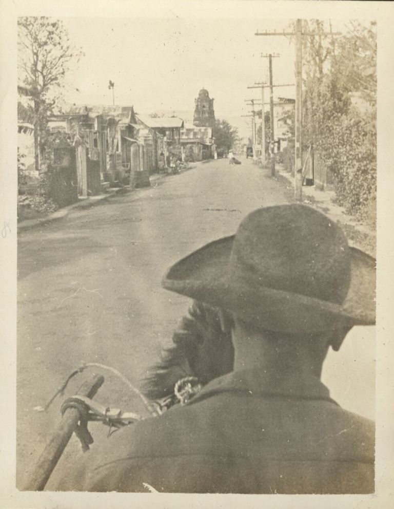 Subject: View from a calesa, looking over the cochero's shoulder as they pass down a street. The church and bell tower in the distance is as-yet unidentified.