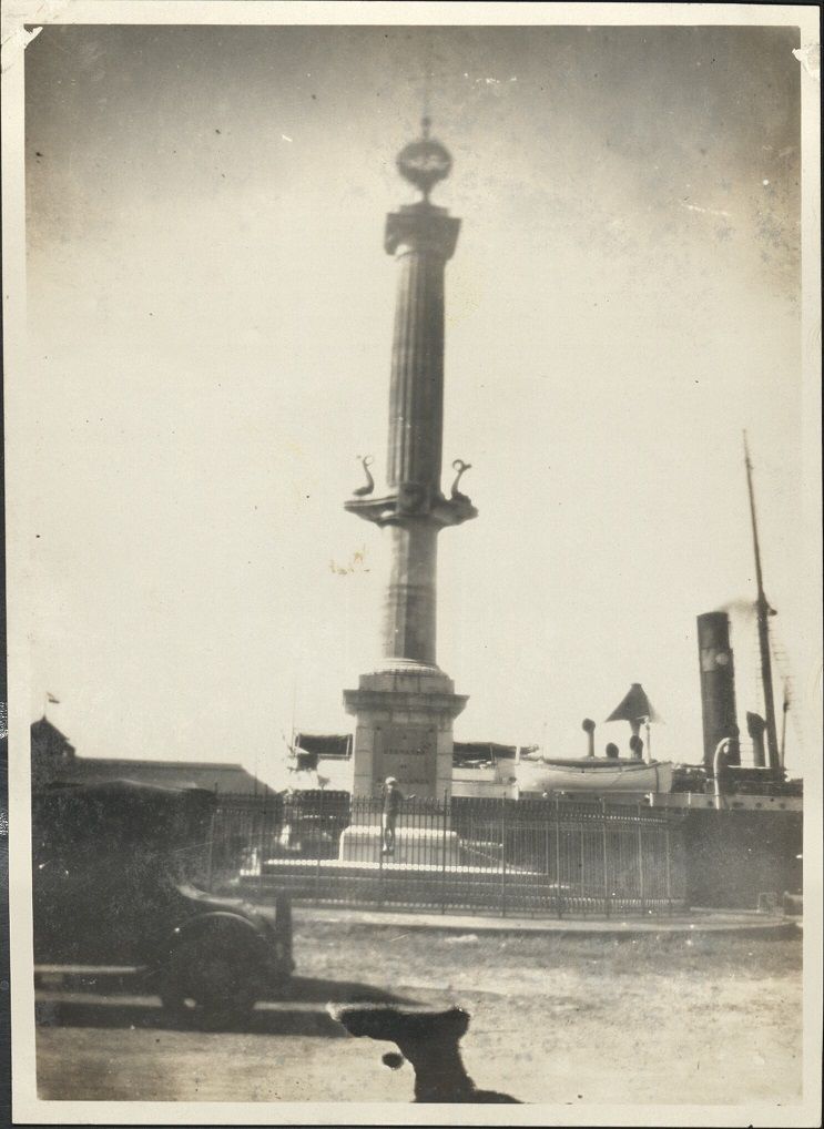 Subject: An automobile drives past the Magellan monument (built 1848), and Paseo de Magallanes just outside the northern Intramuros walls, near the Puerta de Isabel II. Stacks and masts of steamships