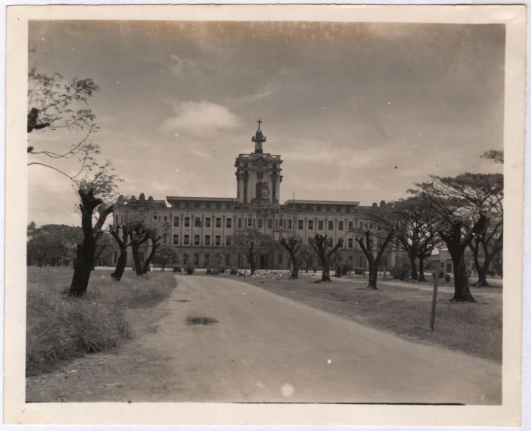 The Main Building at University of Santo Tomas, Manila, shortly after the war. Prisoners in the internment camp used to be able to walk up this road toward the gate "as far as the last tree."