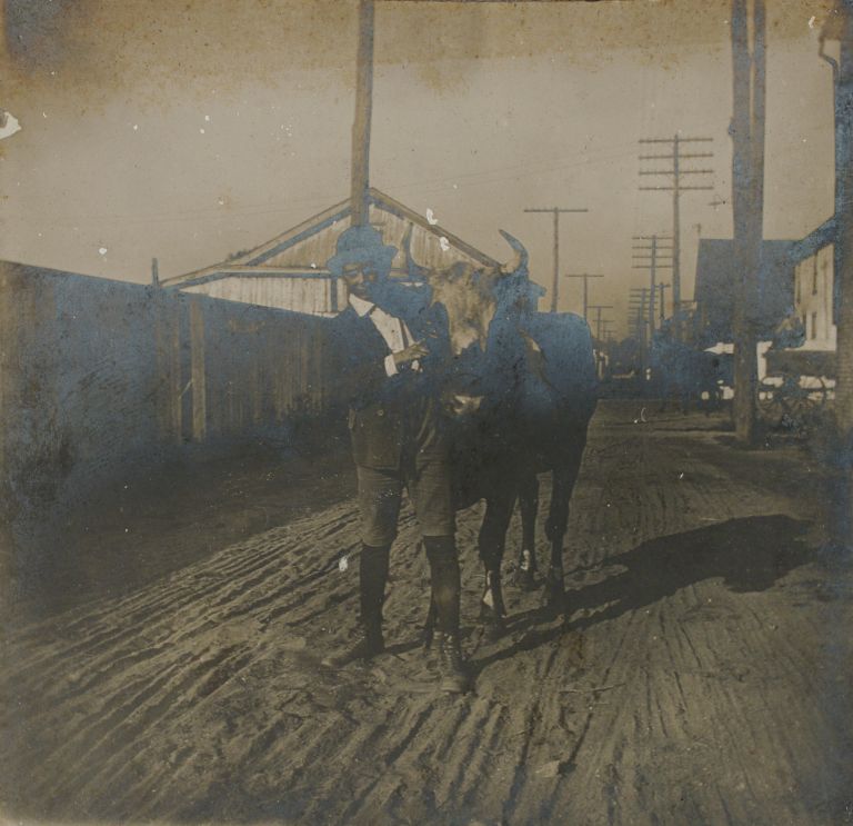 [Untitled - Man poses with a bull, United States].