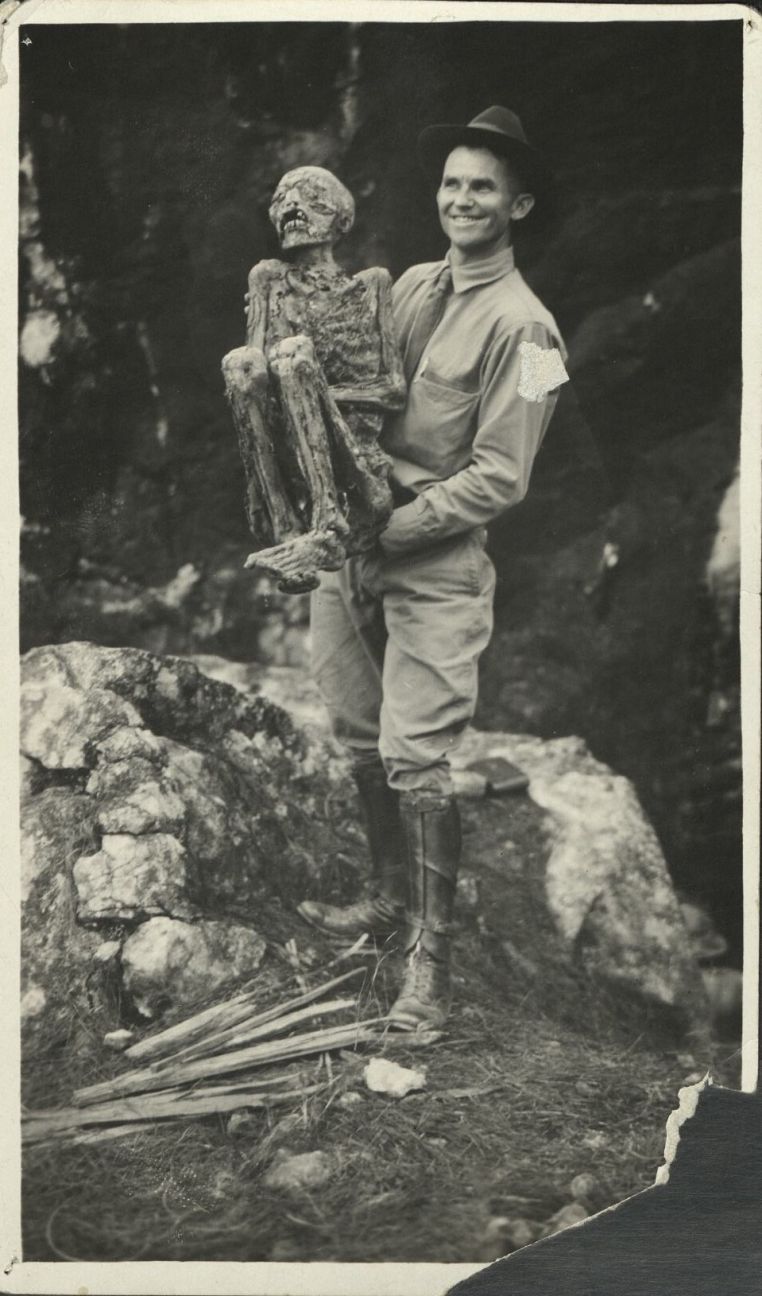 Subject: An American man, perhaps Mr. Thurlow, holds a mummified corpse of a baknang, the more prosperous Ibaloi men, enbalmed in smoke from wood fires near their burial cave in Northern Luzon. A ham-