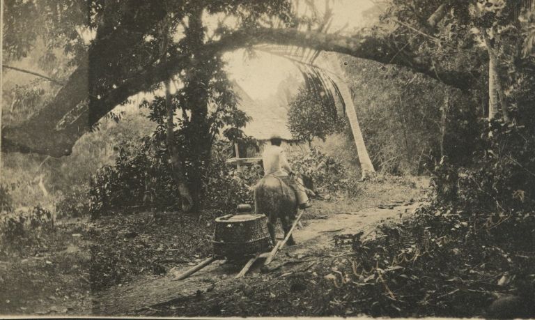 [Untitled - Man rides carabao pulling sled with an enormous basket].