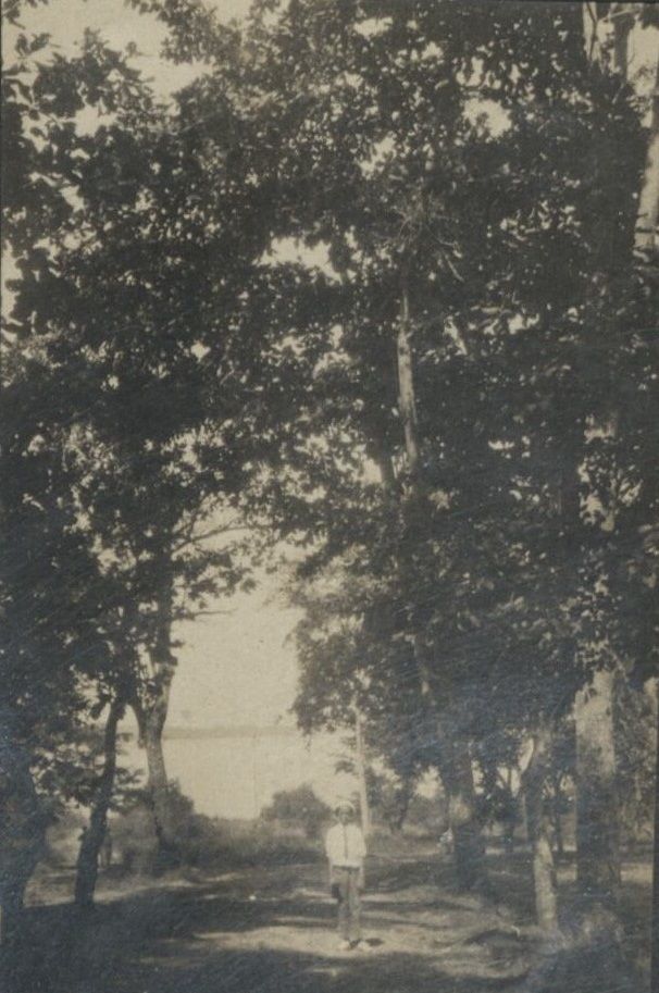 Subject: A man stands in a road beneath very tall, shady trees. Based on the photo sequencing, this could be near Zamboanga.