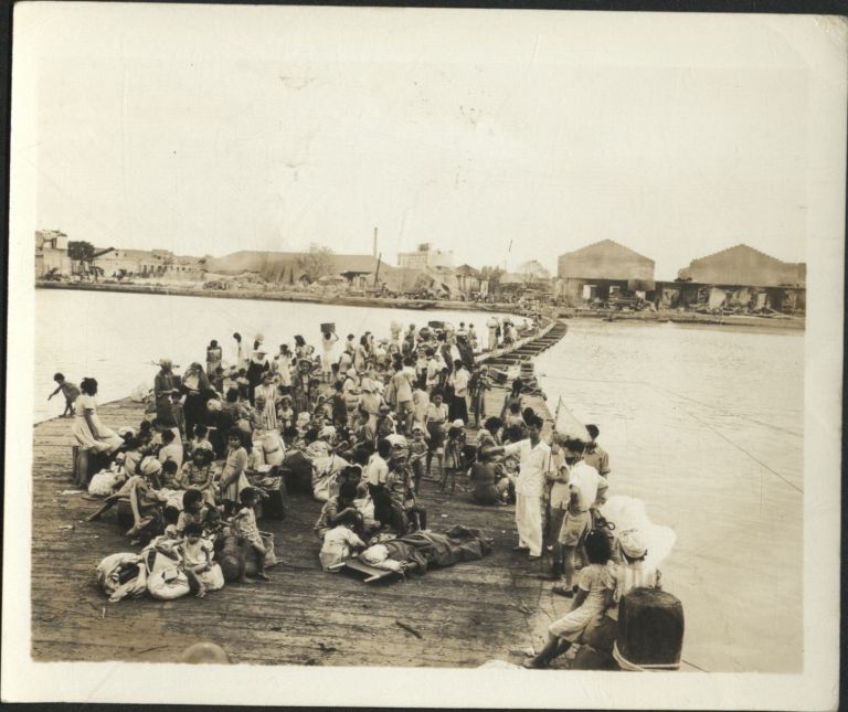 [Untitled - Manila during liberation: Civilian refugees gather at dock by a pontoon footbridge across Pasig River, February 1945].