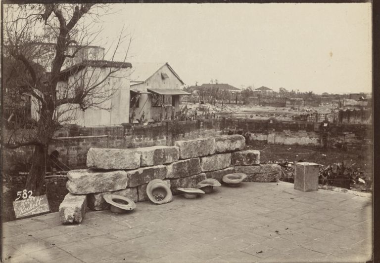 Subject: Stone blocks stacked up as a protective wall for Filipino soldiers to fire from, on a rooftop in Manila. Five hats remain.