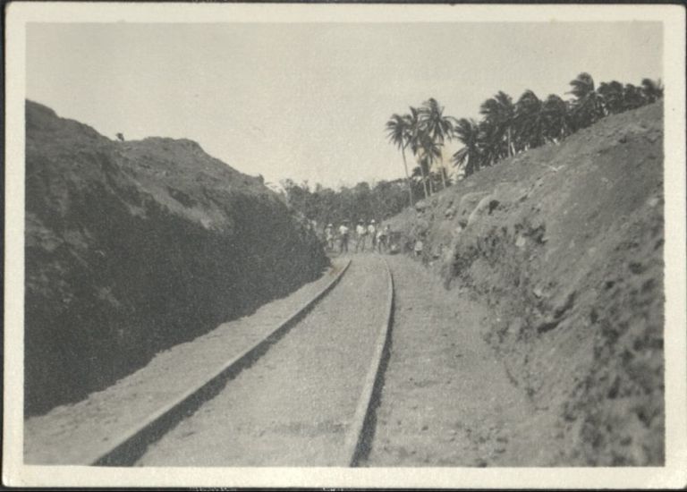 Subject: Work crew poses in distance after excavating dirt and rocks from buried railroad tracks, likely the result of a flood or landslide.