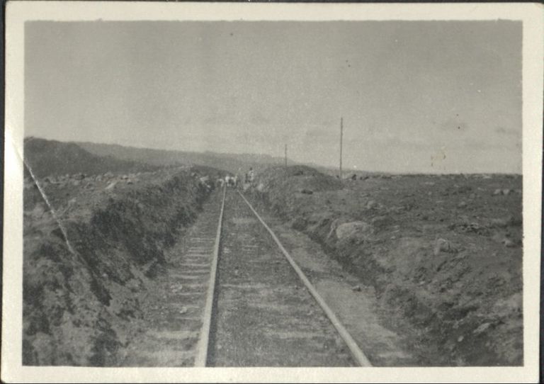 Subject: Group of Filipinos work to excavate dirt and rocks from buried railroad tracks, likely the result of a flood or landslide.