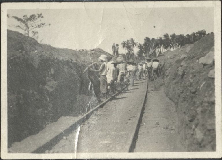 Subject: Group of Filipinos using picks to excavate dirt and rocks from buried railroad tracks, likely the result of a flood or landslide.