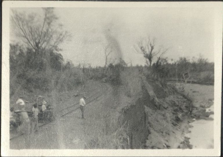 [Untitled - Men inspect railroad tracks barely missed by flood or landslide erosion].