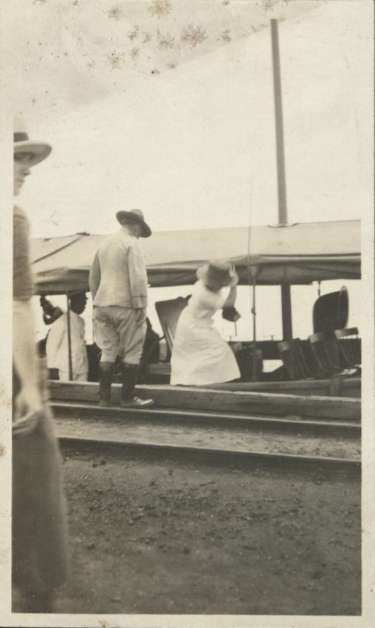 Subject: American military officer and his wife on a pier about to board a ferry boat. This may be at Subic Bay or Manila Bay.