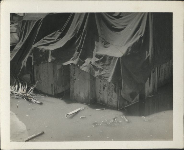 Subject: Crates of supplies and equipment stacked in the water in Manila during the battle for liberation in February, 1945. The tarps were intended to keep them dry, but perhaps a rainstorm flooded t