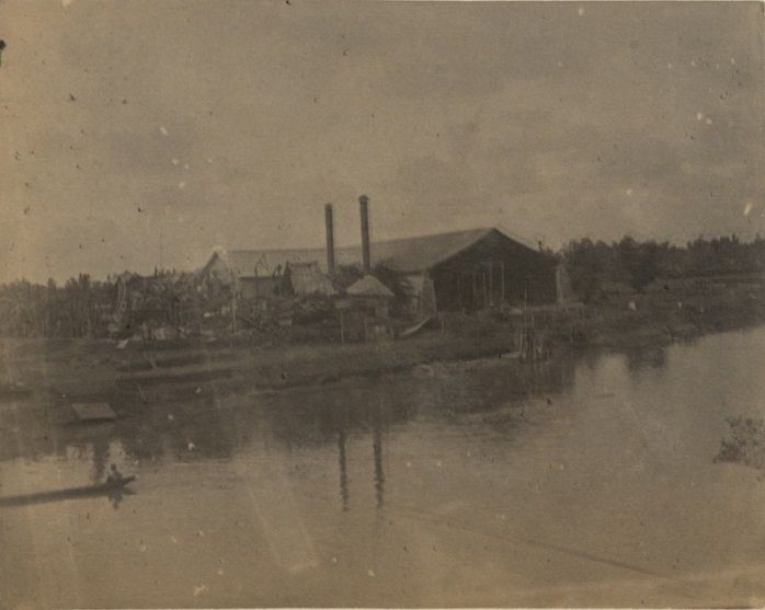 Subject: A mill or factory (sugar refinery?) with two smokestacks along the banks of a Philippine river.