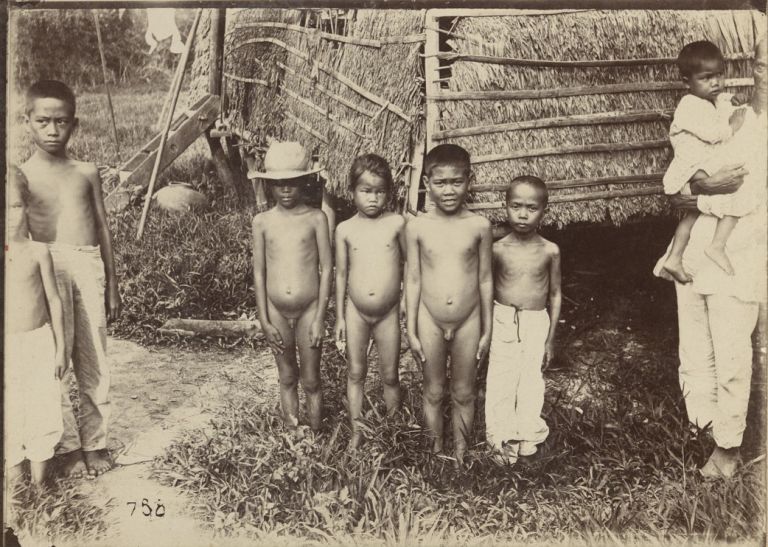 Subject: Group of young Filipino children in various stages of nudity pose in front of a nipa structure - a home, hall, or school.