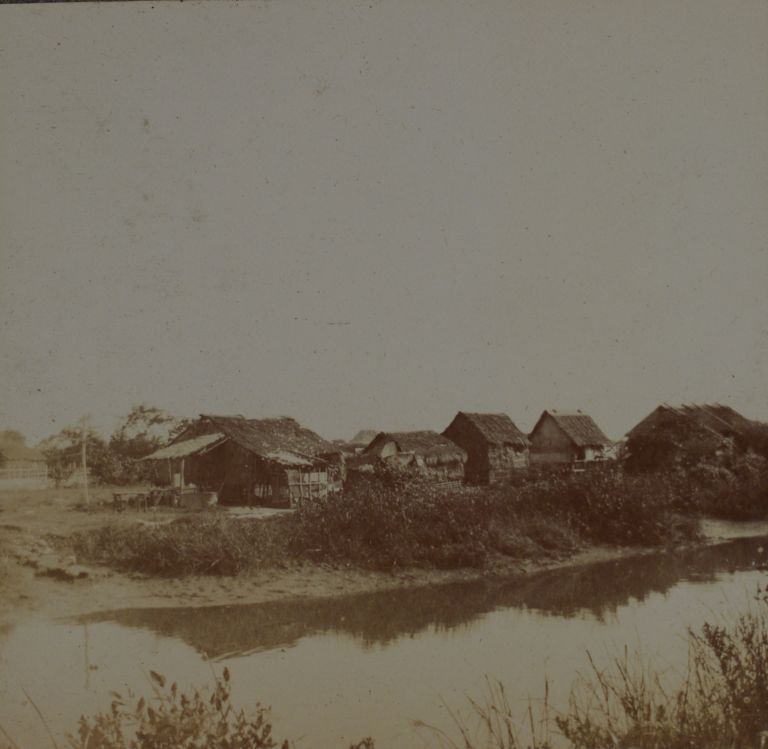 Subject: Nipa and bamboo structures facing a small river or canal, part of a larger town as evidenced by roofs seen in the distance.