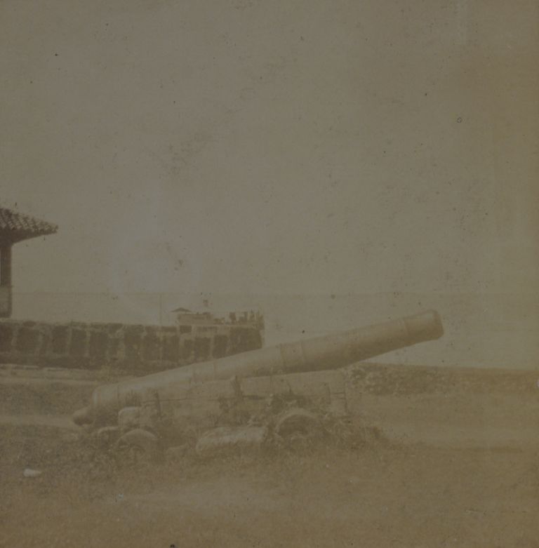 Subject: An old Spanish cannon sits atop fort walls, perhaps at Fort Santiago but it may also be Fort San Antonio Abad in Malate or Fort San Felipe in Cavite. It does appear to look out ove