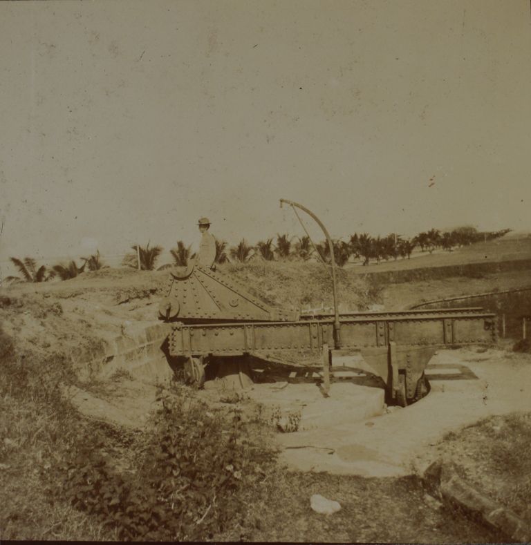 Subject: A gun carriage sits behind an earthen embankment by a palm-lined seashore. This may be the Spanish defenses at Luneta or Fort San Antonio Abad in Malate, or in Cavite. See OFI-0019