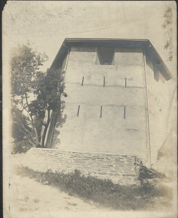 Subject: What appears to be a concrete blockhouse, or a small fortification, with loopholes (a small opening) allowing its defenders to fire in various directions. See also OFI-004108.