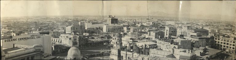 Subject: Panoramic view of Santa Cruz and Binondo. Lower center is Santa Cruz Church; above the bell tower is the curved facade of Philippine National Bank. Almost as interesting as the view is the th