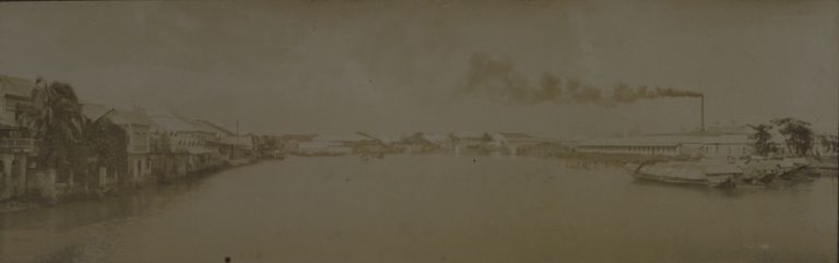 Subject: View from a bridge looking west up the Pasig River, with buildings both sides. If the smokestack on right is the Insular Ice Plant (and it almost certainly is), then this view is p