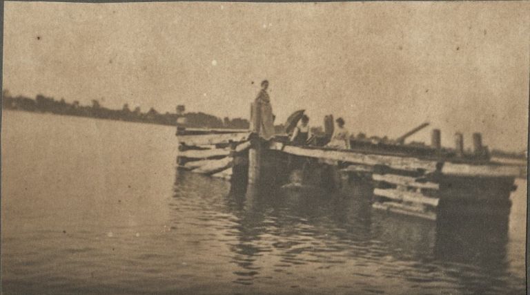 Subject: Fuzzy and discolored photo appears to show passengers waiting on a pier in the river for a boat to arrive.