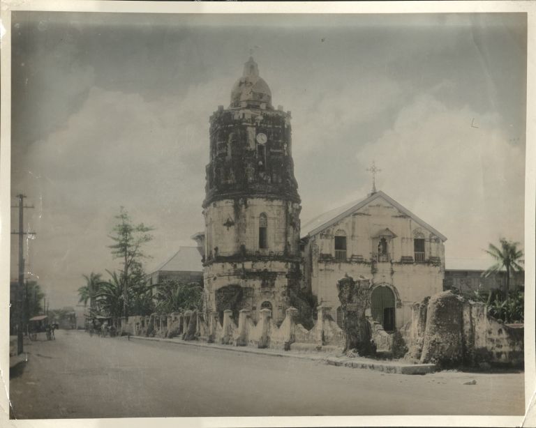 Subject: Presently unidentified church and massive bell/clock tower on a city street corner. Note the interesting stone fence.