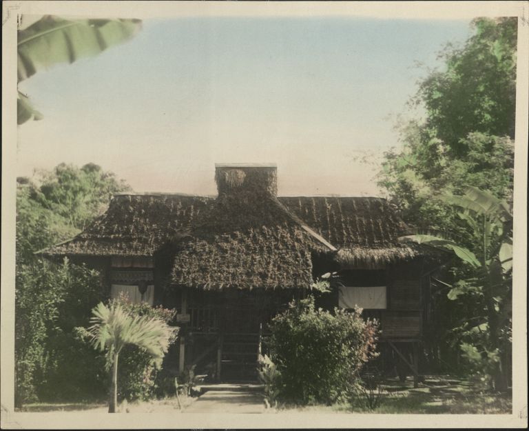 Subject: A Filipino house or office with porch, thatched roof, and yard with ornamental plants. What's unusual is what appears to be a chimney in the structure - perhaps for cooking,