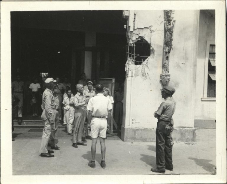 Subject: Philippine president Sergio Osmena and military officers tour and greet freed detainees at Santo Tomas Internment Camp in Manila; a shell hole appears in the building's facade. The camp was t