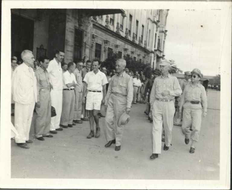Subject: Philippine president Sergio Osmena and military officers tour and greet freed detainees at Santo Tomas Internment Camp in Manila. The building is UST's Main Building. The camp was the largest
